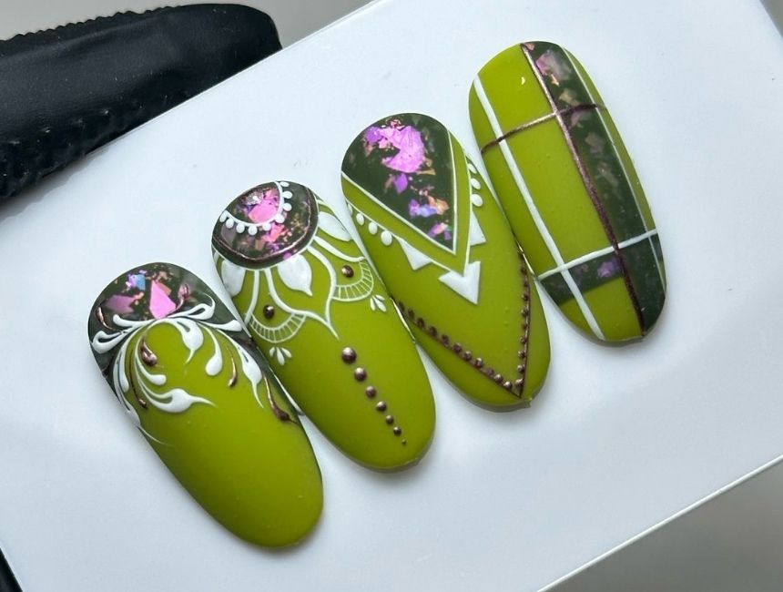 Cette approche fonctionne particulièrement bien sur des longueurs moyennes à longues, où la surface de l’ongle offre plus d’espace pour structurer le design, jouer avec les volumes et affirmer le thème sans perdre en élégance.