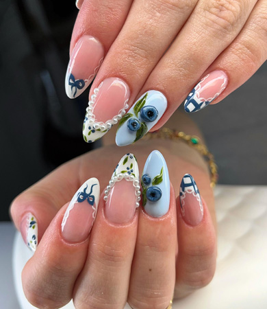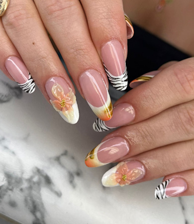 Appliquez les Cool Colors 035 – Hortensia, 037 – Bleu Ciel, 038 – Bleu Pavot, en réalisant des formes variées et géométrique qui se rejoignent sur l’ongle afin de créer un effet graphique et printanier. Polymérisez 30 secondes sous UV/LED.