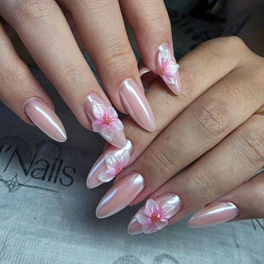 Au-delà des couleurs et des formes, les textures jouent un rôle essentiel dans les tendances actuelles. Elles permettent d’apporter de la lumière et du relief sans forcément ajouter de complexité au design. Les effets chromés restent présents, mais dans une version plus douce et plus portable : Chrome perlé, effet glazed et reflets nacrés. Ces effets s’intègrent facilement dans des poses printanières, notamment sur des bases nude ou pastel. Les textures translucides, aussi appelées “jelly”, gagnent également en popularité. Elles apportent un effet léger et moderne. Ce type de rendu permet de créer des looks originaux, tout en restant dans l’esprit de la saison.